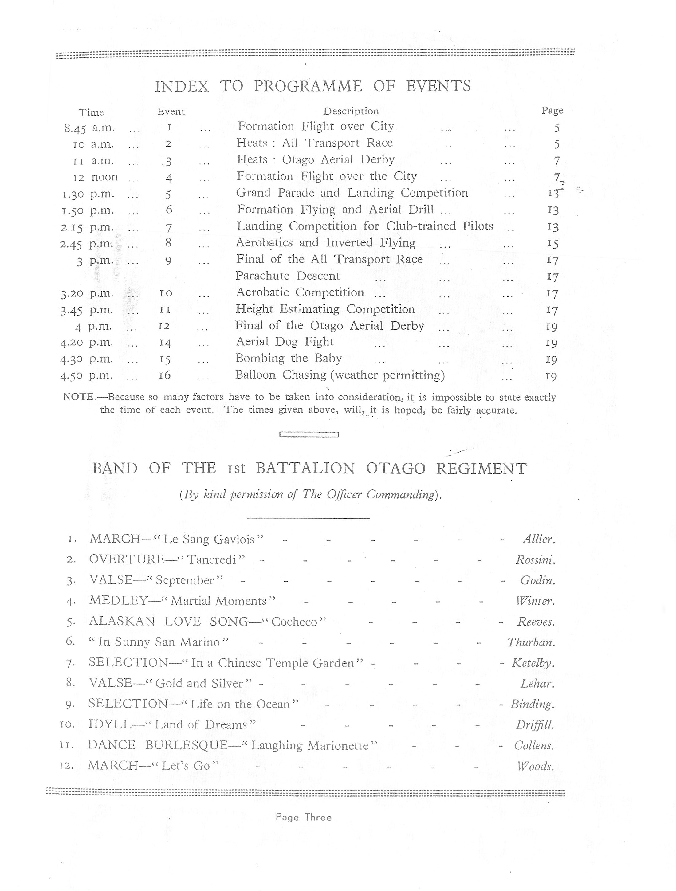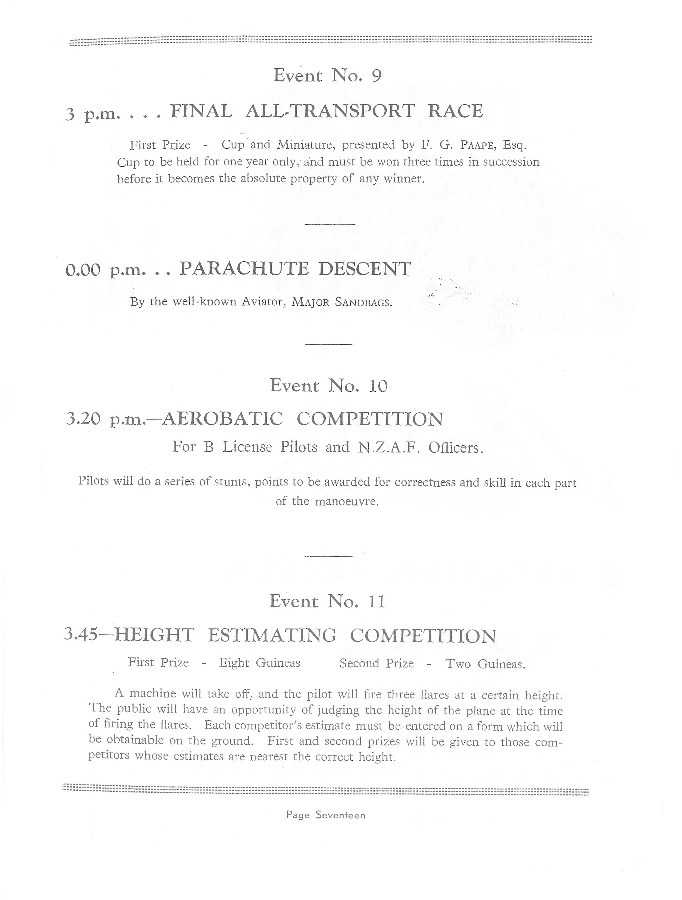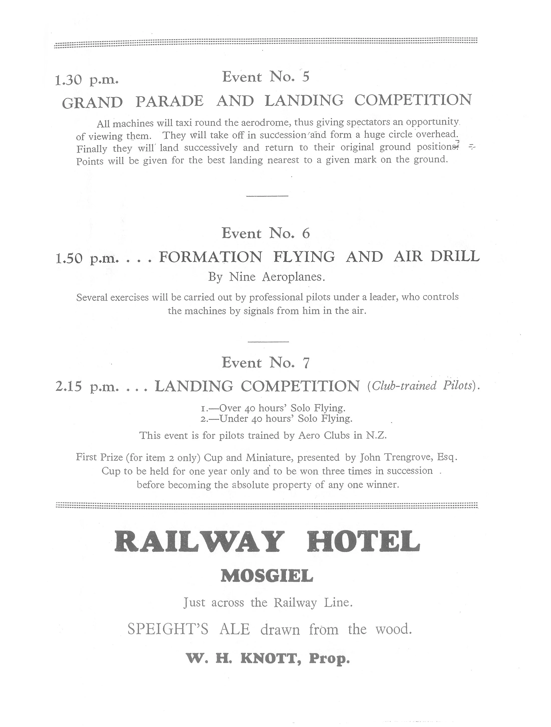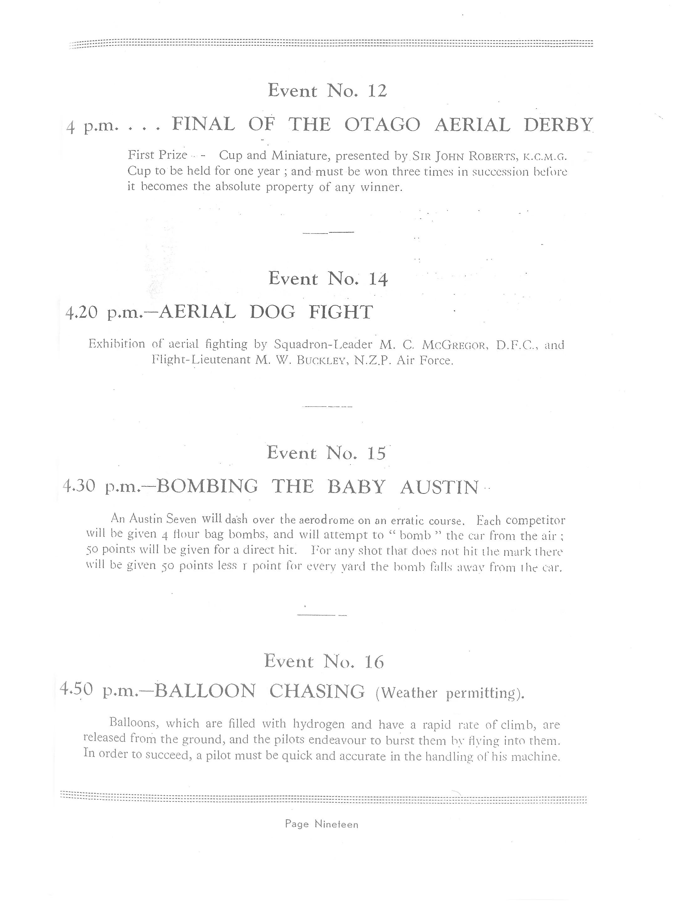 The Air Pageant was a great success, with over 10,000 people in attendance. The Evening Star would report the pageant with the headlines, “Thrills at Taieri”, “Exciting Aeroplane Races” and “Sensational Acrobatics in Mid-Air”.